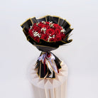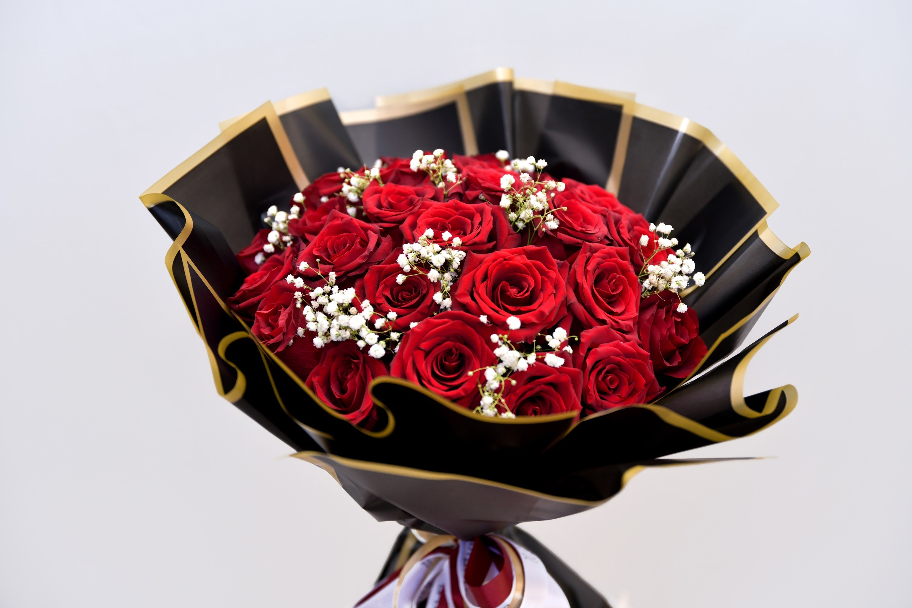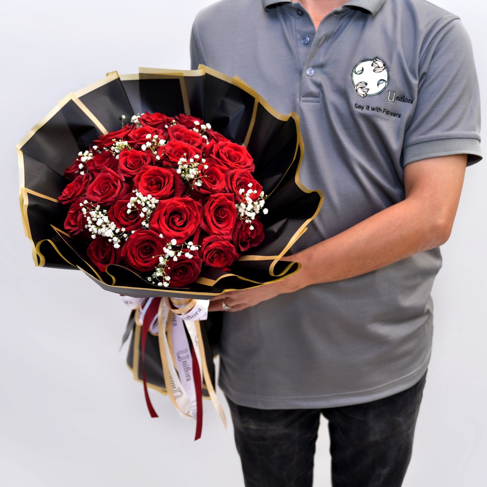 باقة كلاسيكية من الورود الحمراء تحتوي على 25 وردة حمراء مع لمسة مثالية من الجبسو الأبيض الجميل، ملفوفة بشكل أنيق في تباين عميق من الغلاف الأسود، من المؤكد أن هذه الباقة ستفوز بقلبها!