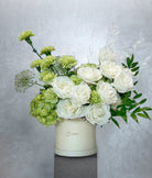 Meadow brings a gentle, fresh vibe in a soft white flower box. Featuring delicate green carnations, airy ammi majus, tender light green hydrangeas, and pure white roses, this arrangement offers a calming blend of soft greens and whites.