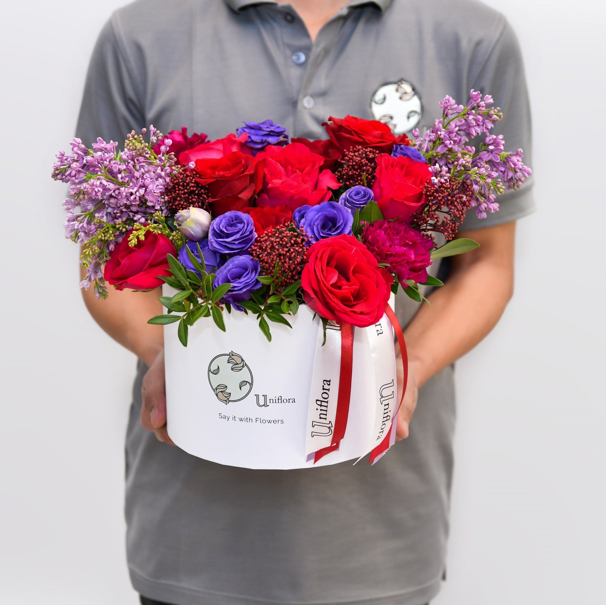 تحتوي على : 4 قرنفل أرجواني، 6 ورد وردي فوشيا، 7 ورود حمراء، 4 سرنجة، 5 ليسانثوس، سكيميا، أوراق الفستق.