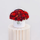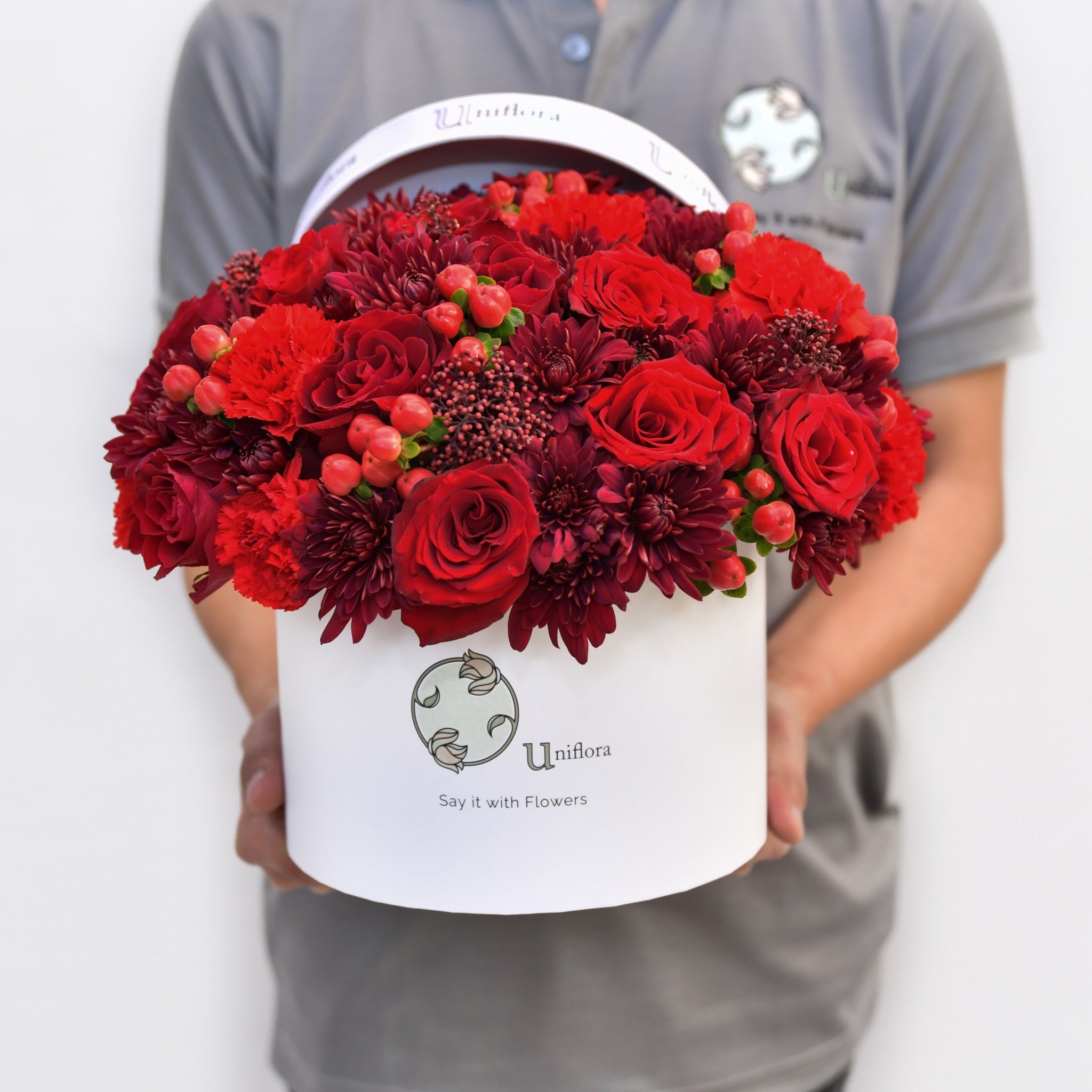 استمتعي بسحر اللون الأحمر الغني مع صندوق الزهور Scarlet Desire، الذي يتحدث بلغة الحب والدفء والأناقة. تتميز هذه المجموعة الزهرية الفاخرة بمزيج مذهل من الورود القرمزية العميقة والقرنفل المخملي والأقحوانات المورقة والتوت الأحمر الرقيق، وكلها مرتبة بشكل جميل في صندوق أبيض كلاسيكي.