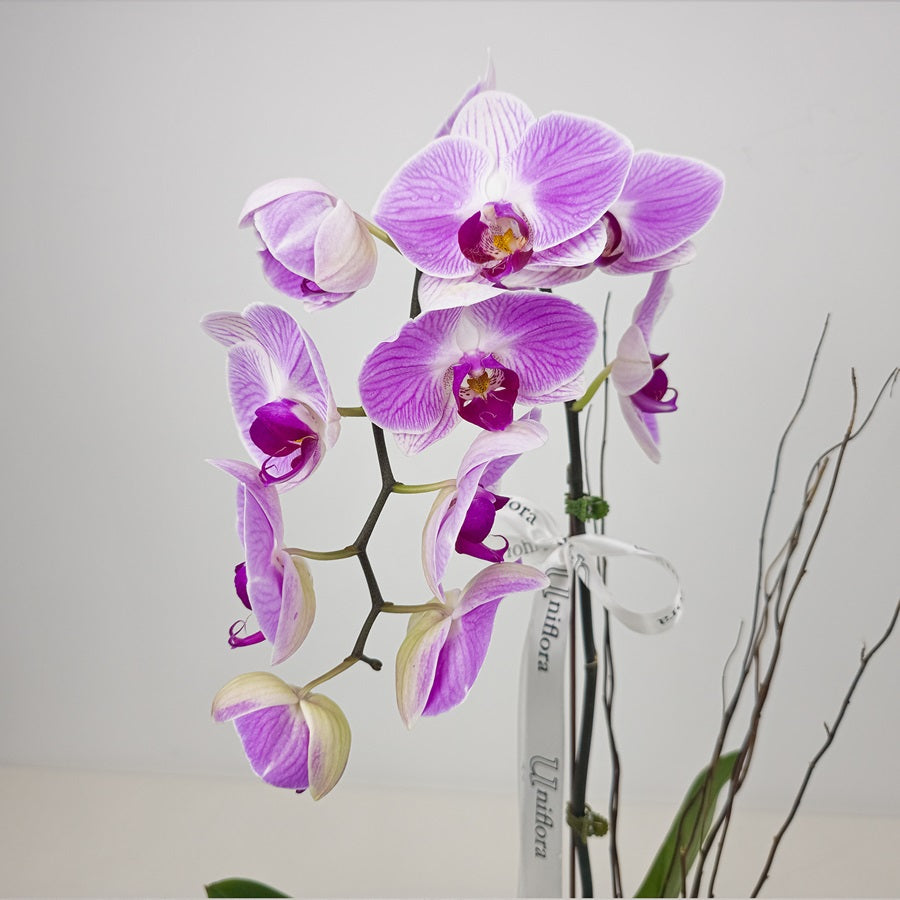 أضف لمسة من الرقي والجمال الطبيعي إلى منزلك مع تشكيلة زهور الأوركيد الأرجوانية التي تتميز بمزيج رائع. أضف لمسة من الرقي والجمال الطبيعي إلى منزلك مع هذه المجموعة المذهلة من الأزهار.