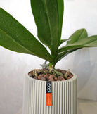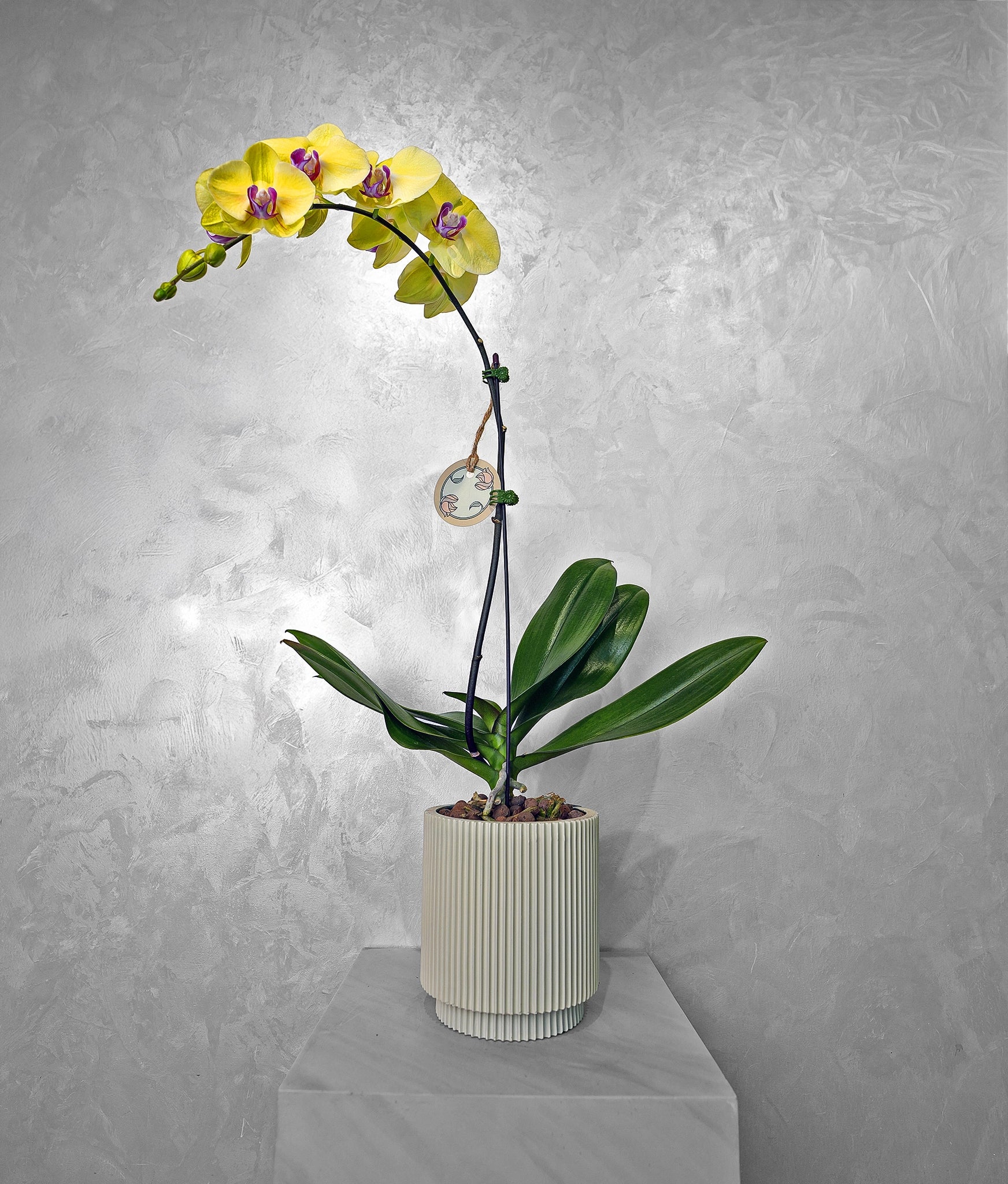 A spectacular display of golden-yellow petals with a rich, colorful heart that seems to glow. The plant is perfectly complemented by its sleek, textured cream pot, making it a luxurious statement of warmth and joy.