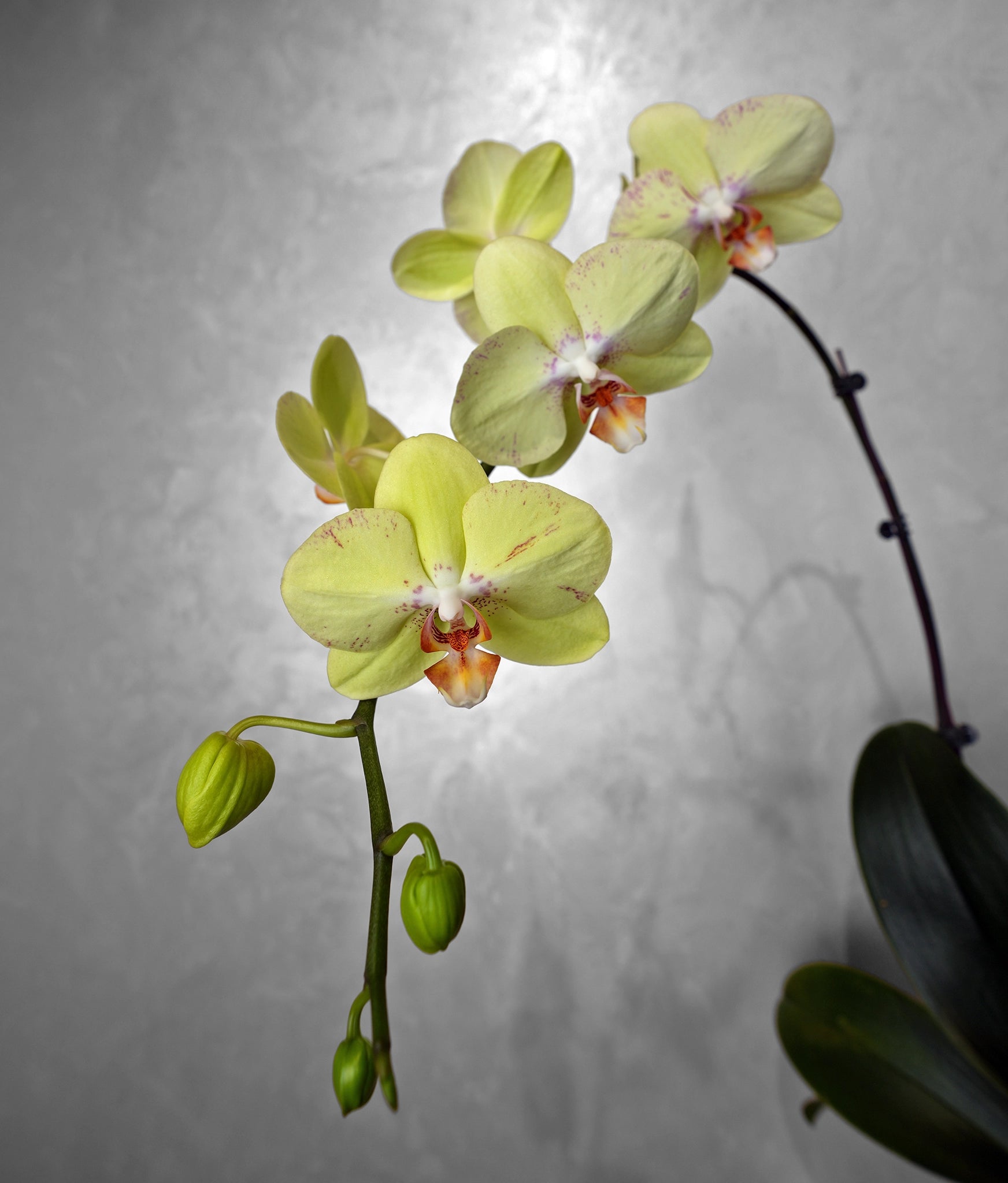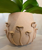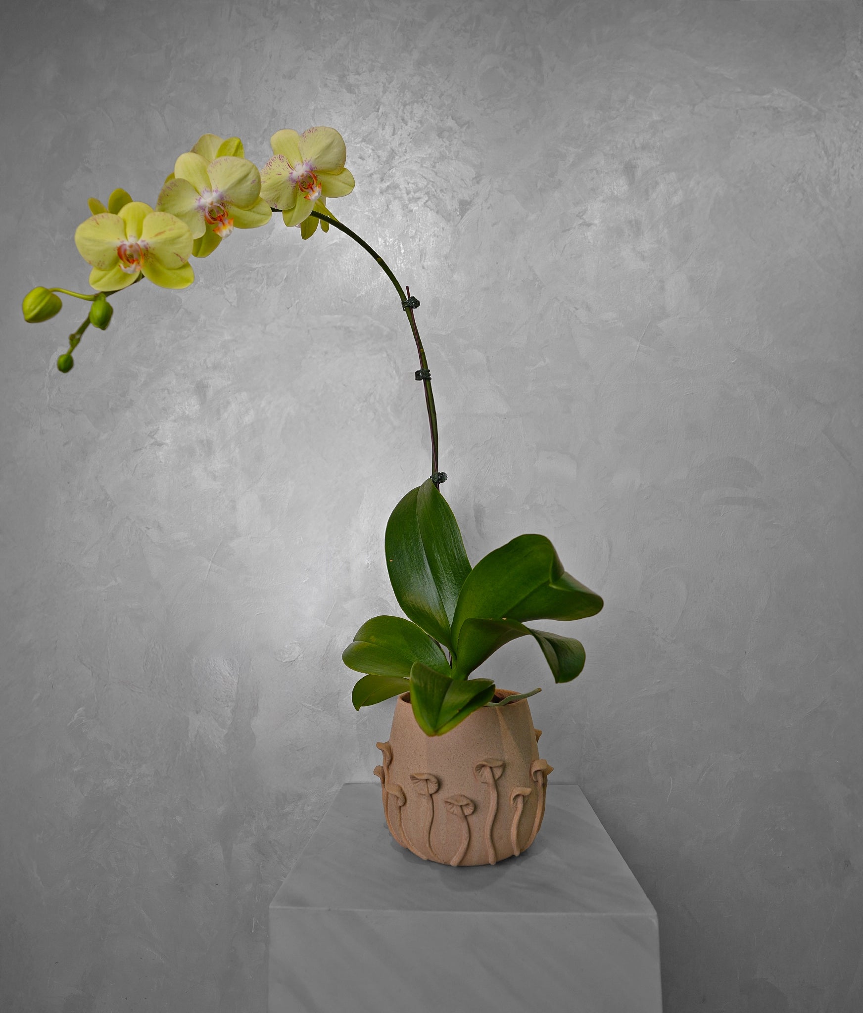 A magical and whimsical arrangement featuring a yellow orchid with delicate speckles. The plant is perfectly showcased in a rustic, textured pot adorned with a charming, nature-inspired design, evoking the serene secrets of an enchanted forest.