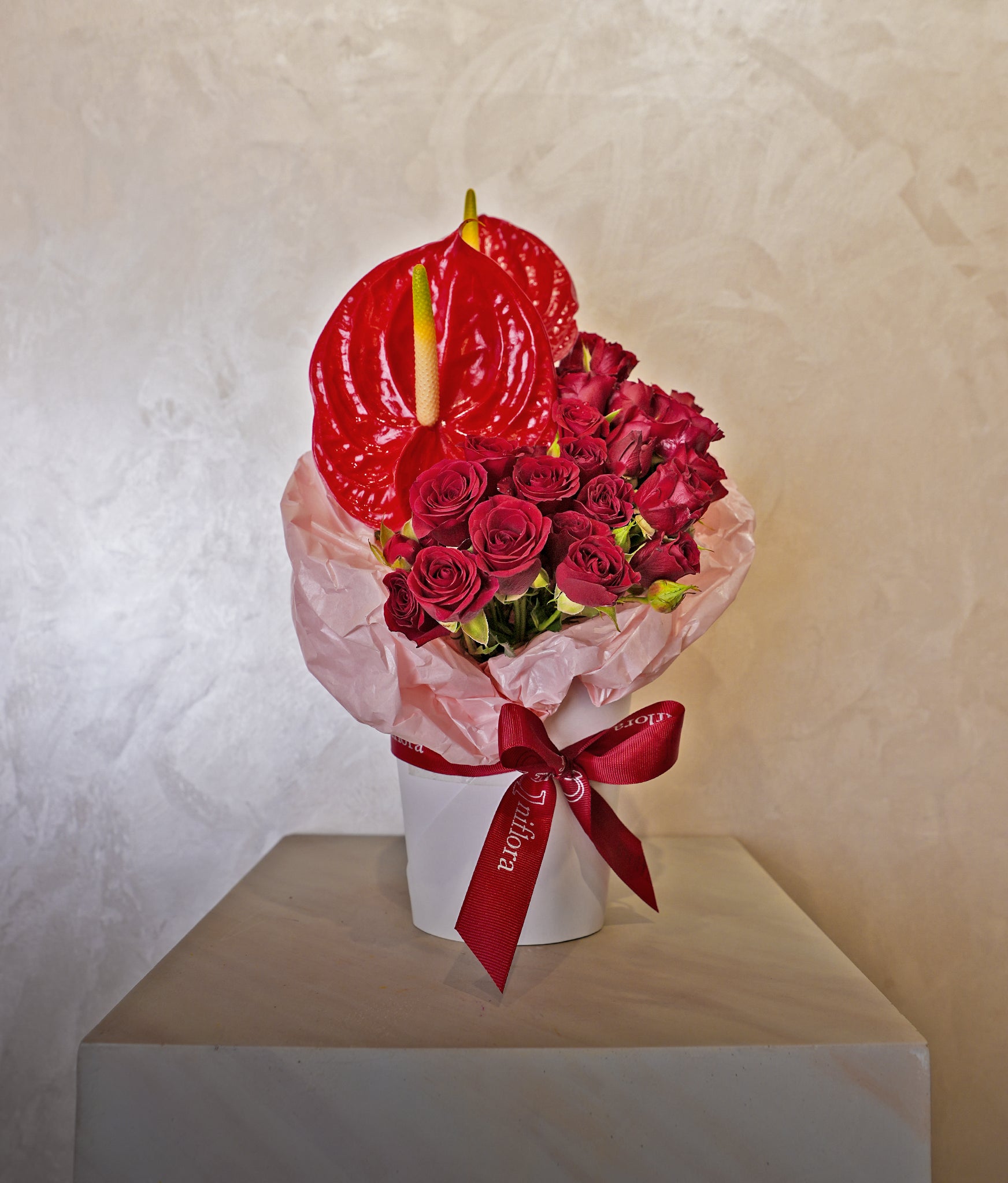 تعبير جريء عن الحب، تتميز باقة "لهيب الحب" بأزهار الأنثوريوم الحمراء النابضة بالحياة المقترنة بالورود الحمراء الفاتنة، رمزًا للشغف والرغبة والمودة العميقة. تضفي أزهار الأنثوريوم اللامعة لمسة عصرية منحوتة، بينما تضفي الورود الكلاسيكية لمسة رومانسية خالدة، لتشكل معًا بيانًا للحب لا يمكن تجاهله.