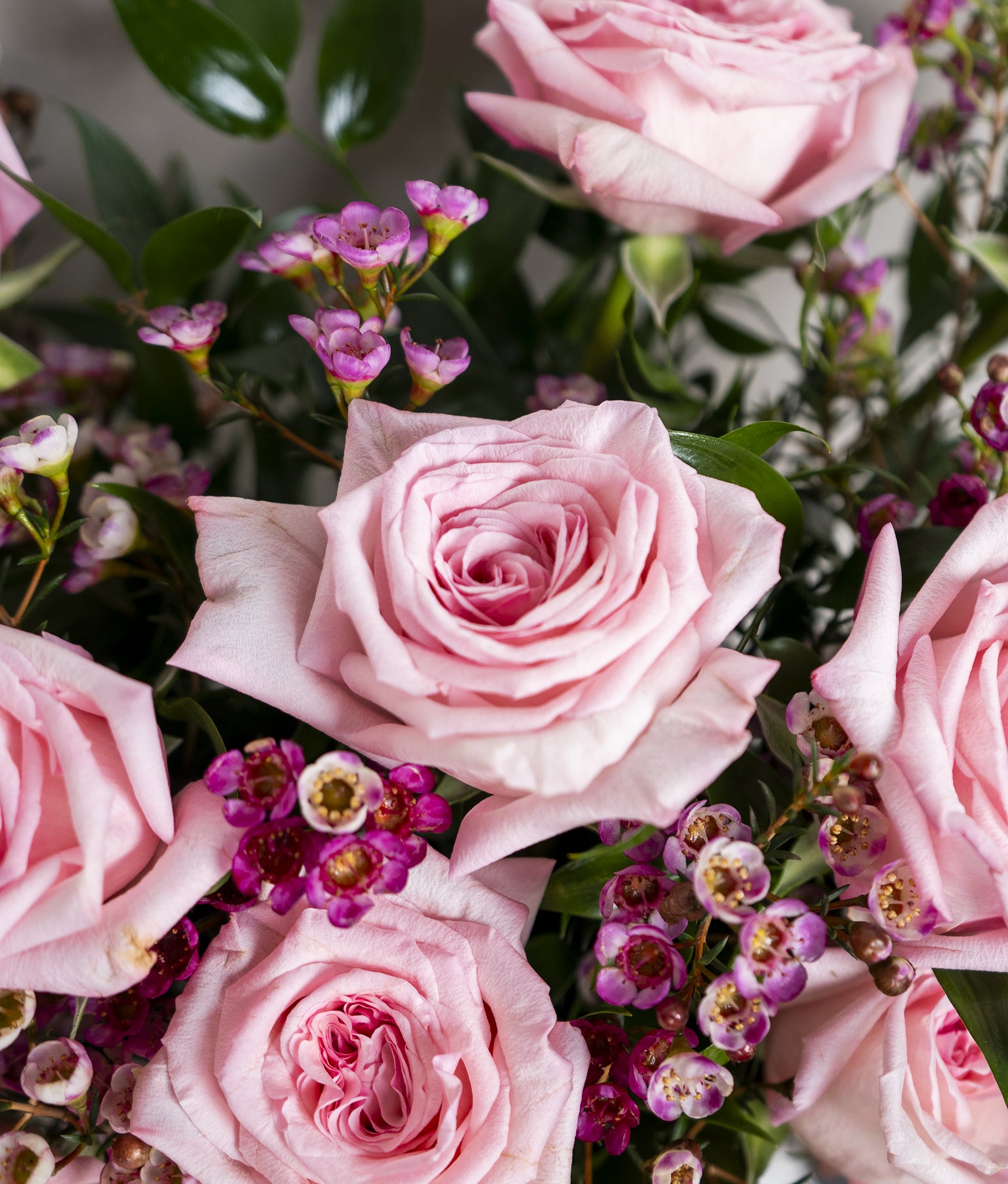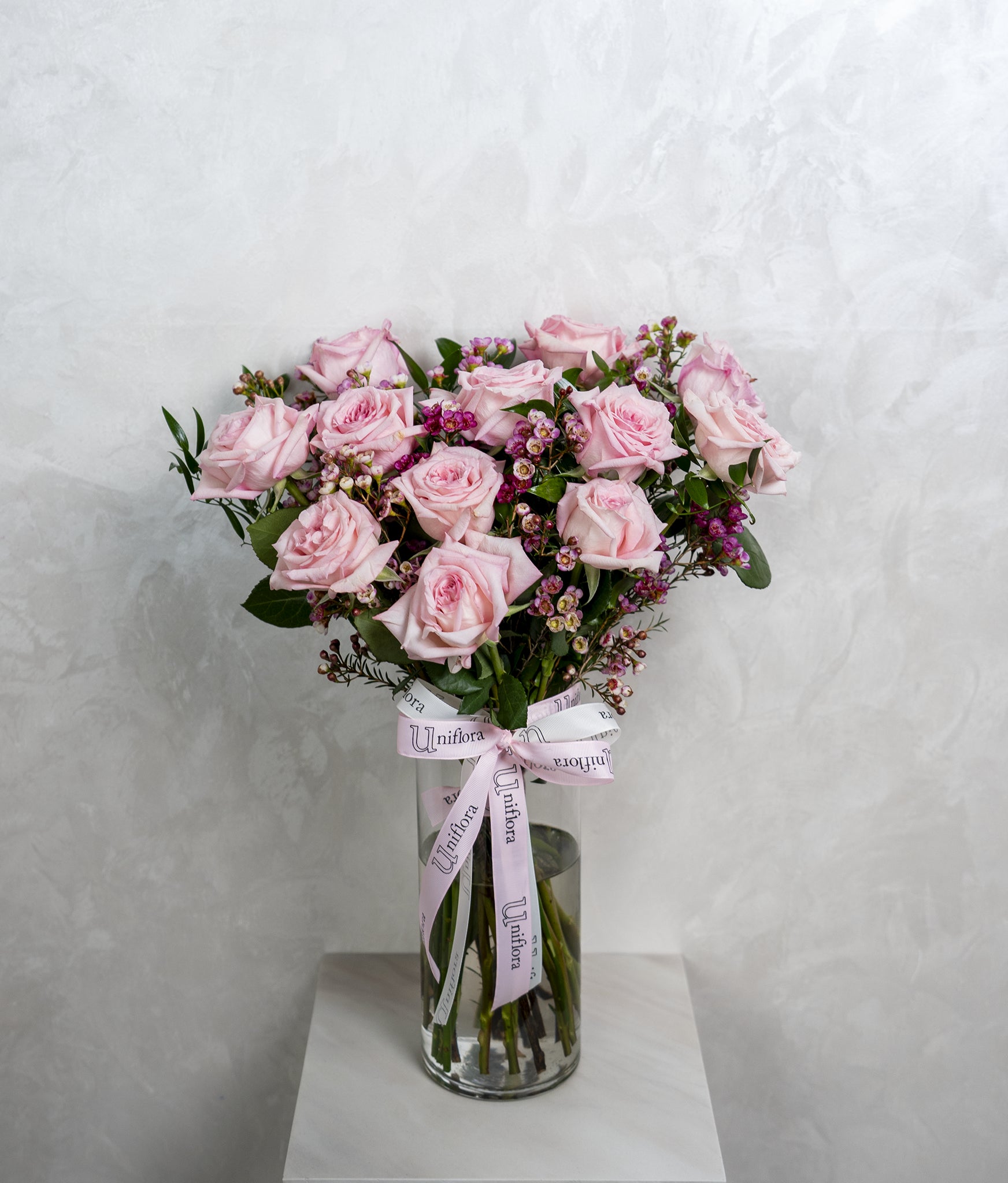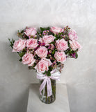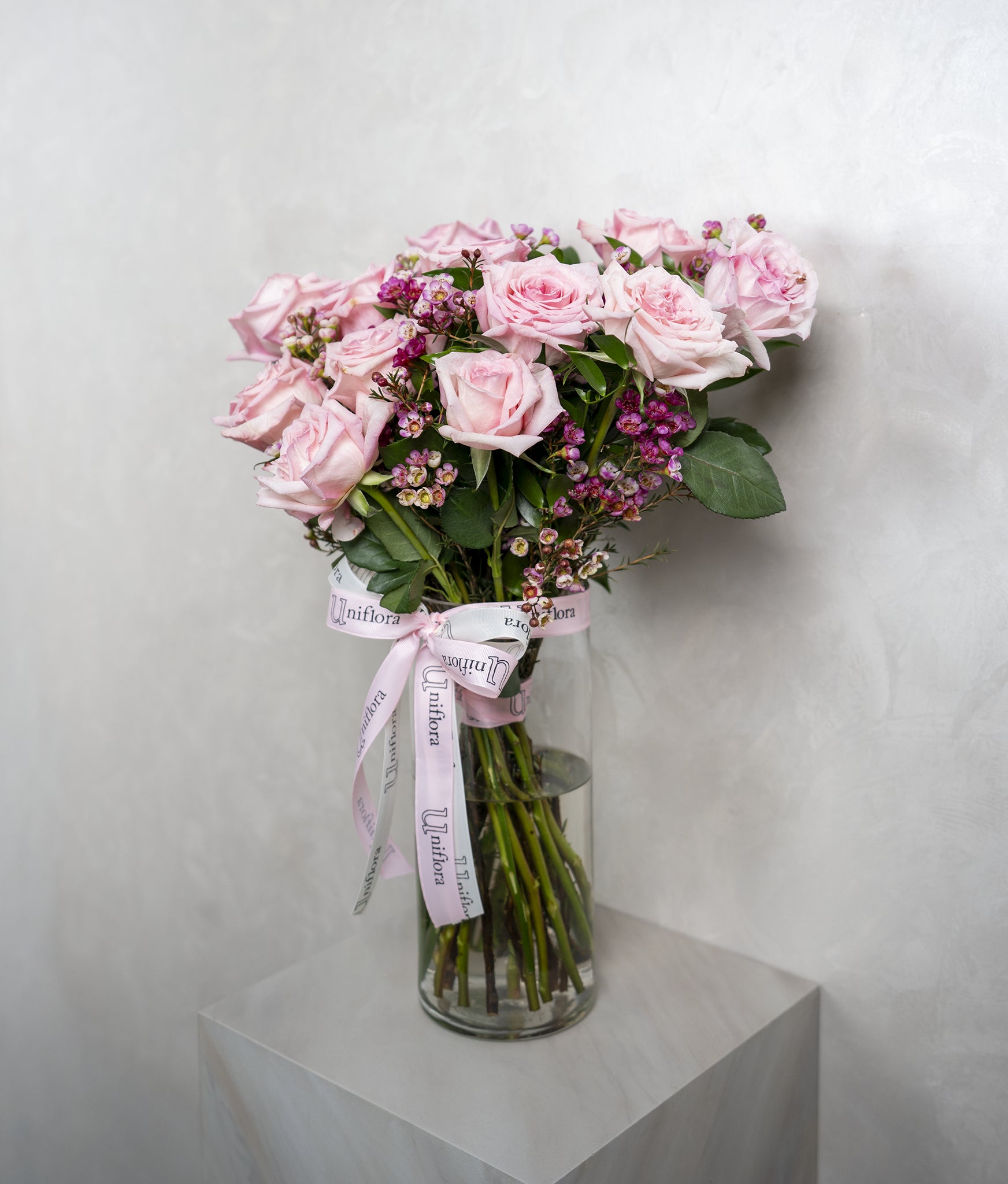 A timeless and elegant arrangement featuring classic pink roses delicately accented with wax flowers. Simply styled in a clear glass cylinder vase filled with water, this design highlights the natural beauty of each bloom. Clean, romantic, and effortlessly refined—perfect for expressing love, appreciation, or heartfelt moments 🌹🤍
