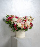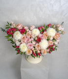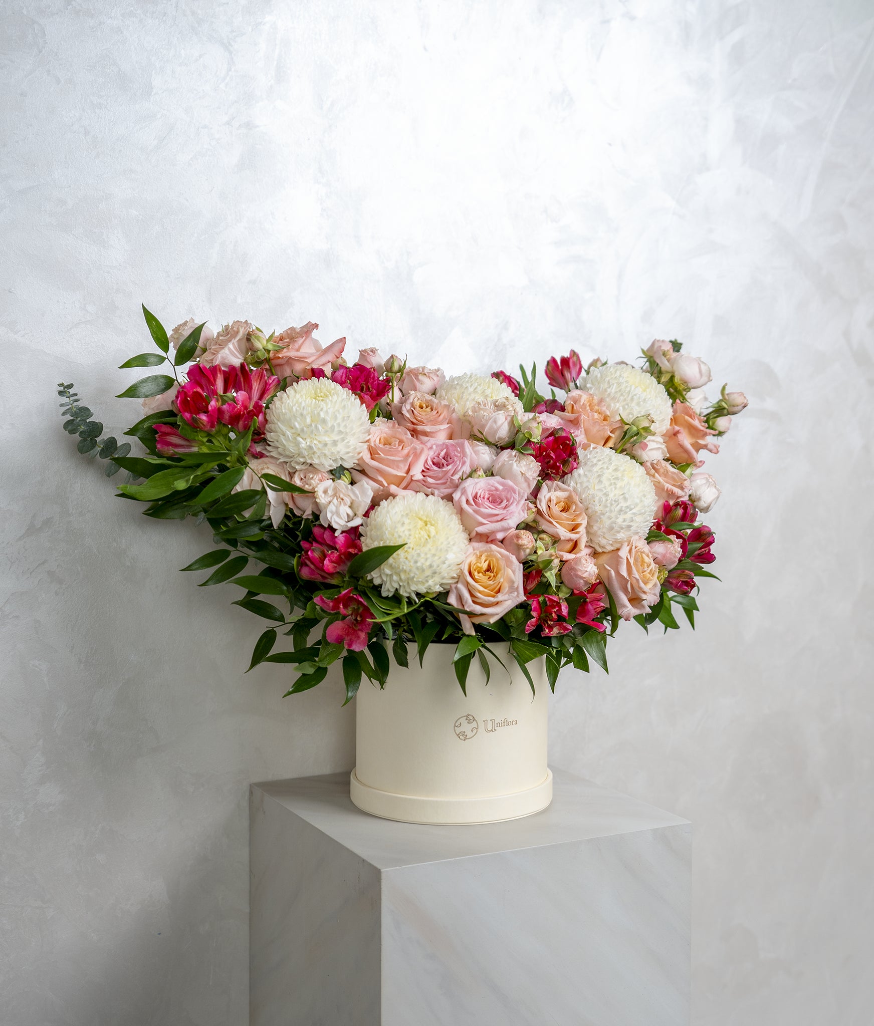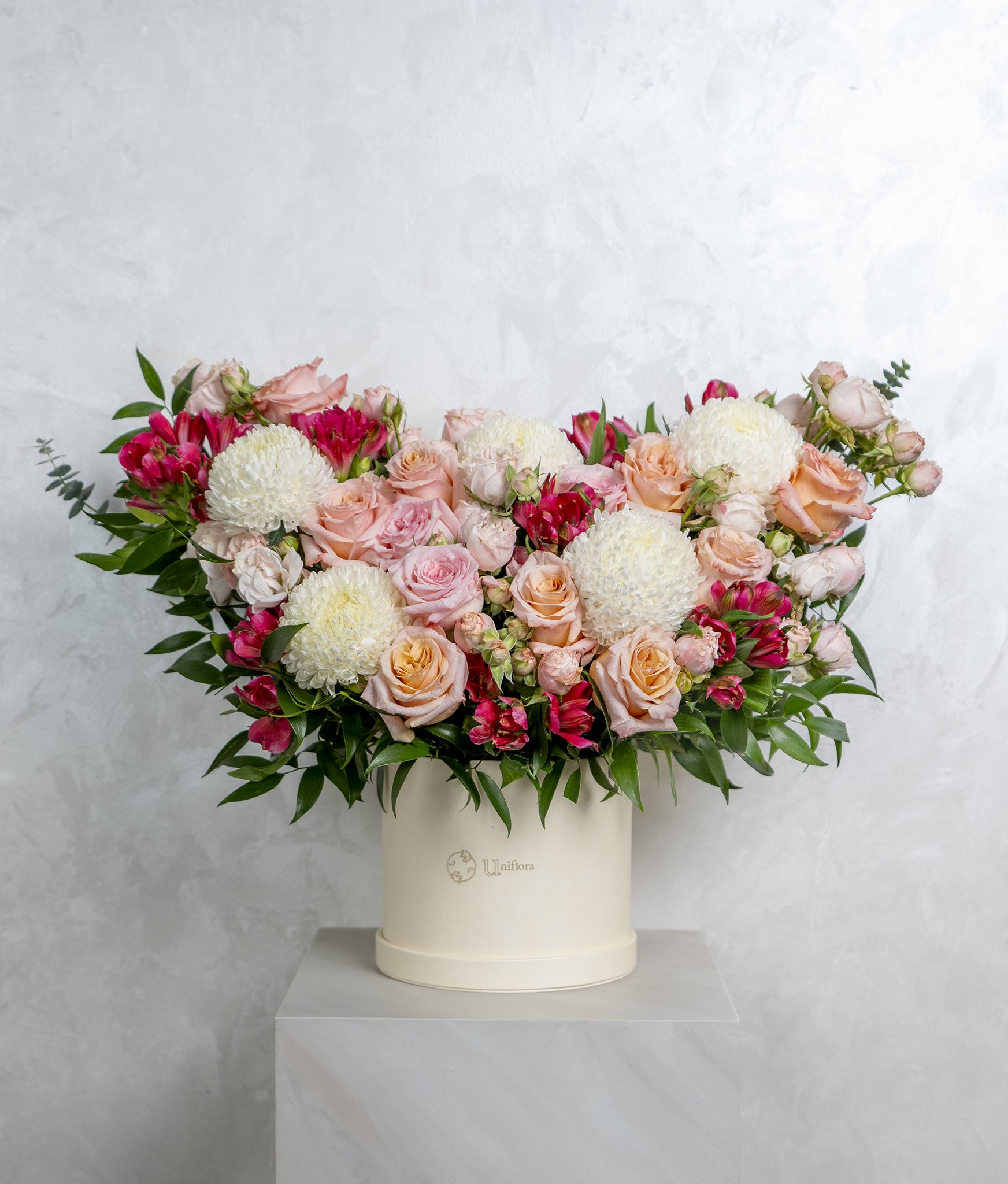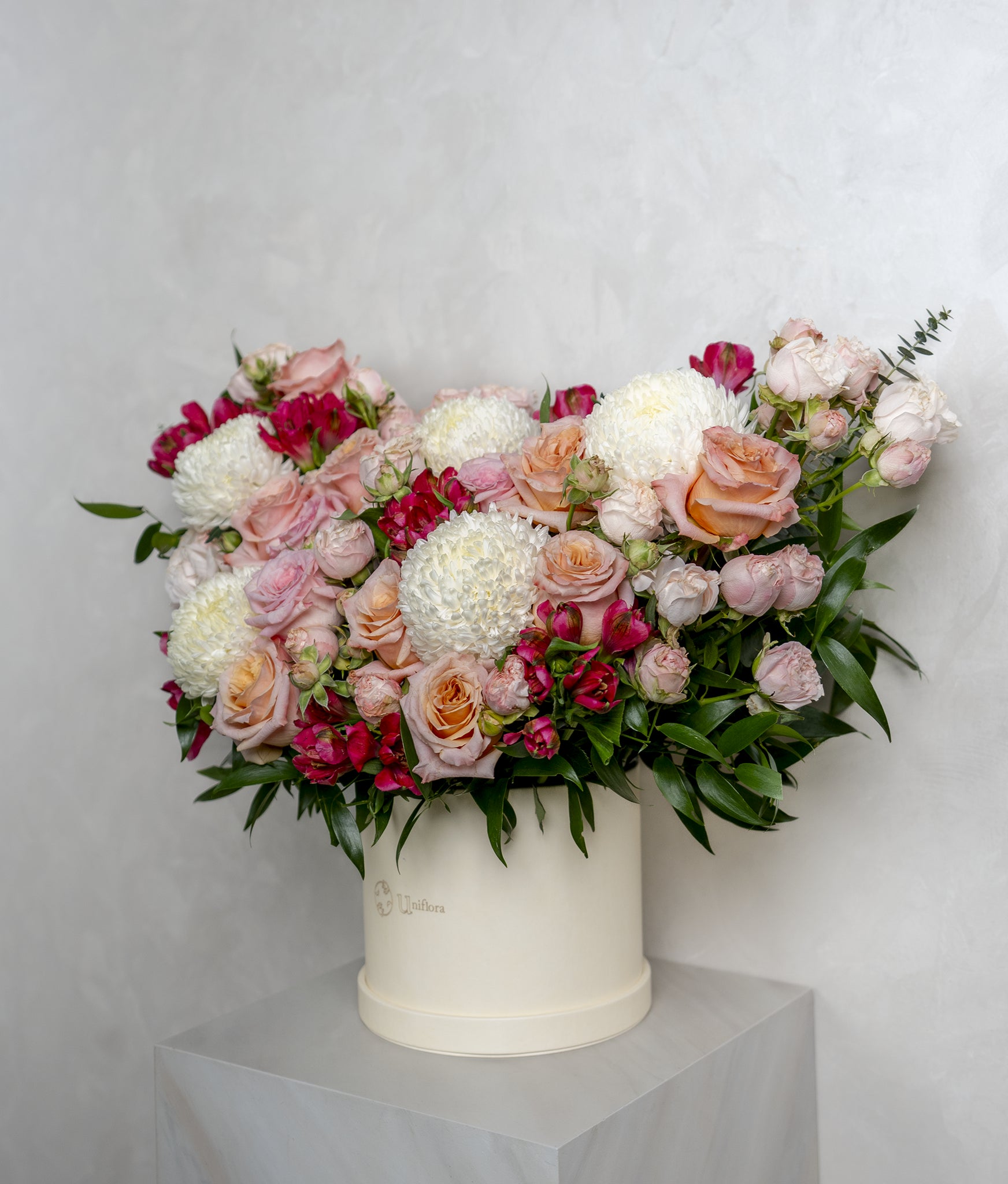 Cotton Blush is a soft, romantic flower box designed in delicate pastel shades of white and pink. Fluffy statement chrysanthemums create a cloud-like base, paired with elegant roses and graceful alstroemeria for depth and movement. The blend feels light, airy, and effortlessly refined—like petals kissed by morning light. Perfect for moments that call for tenderness, warmth, and timeless beauty 🌸
