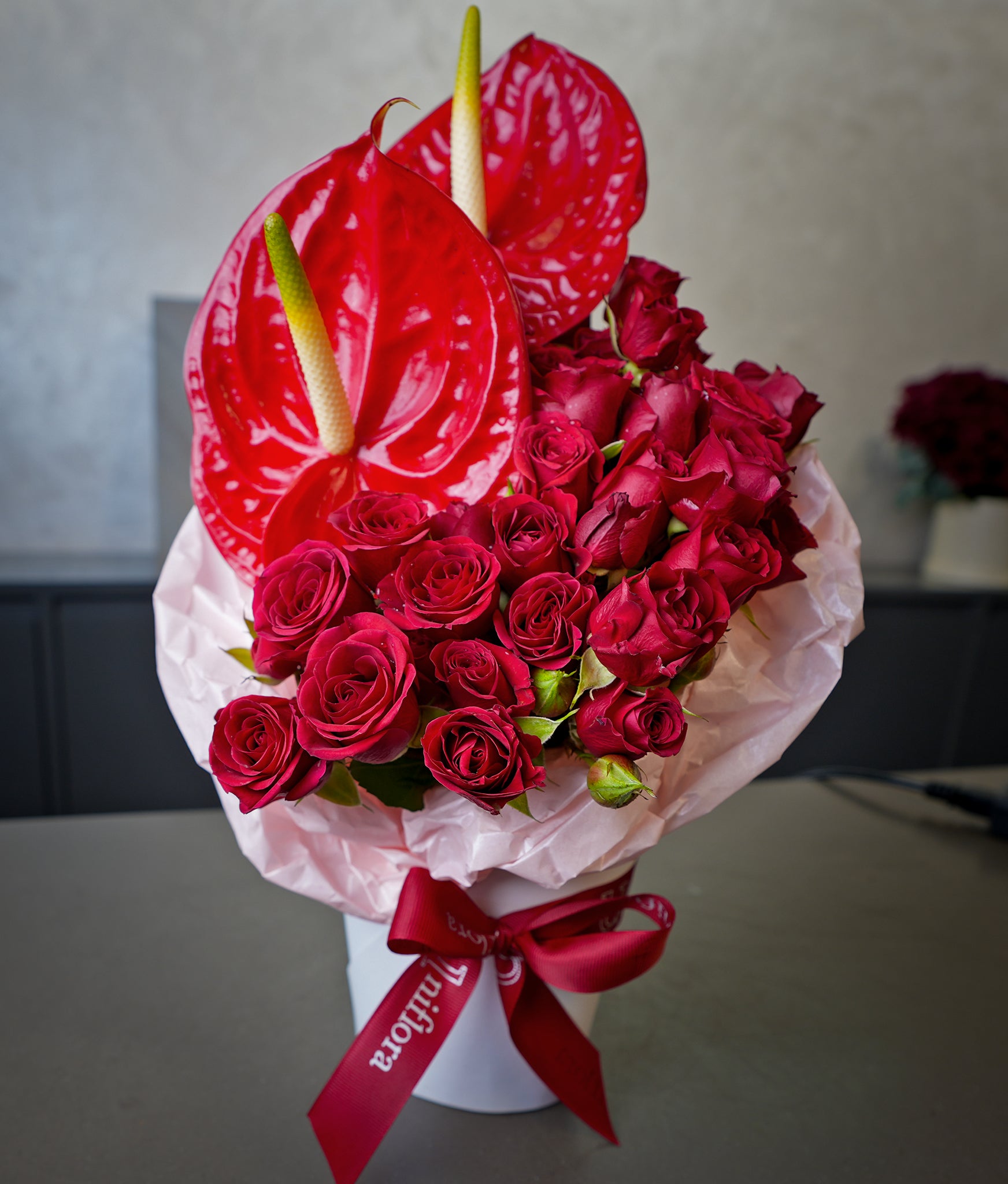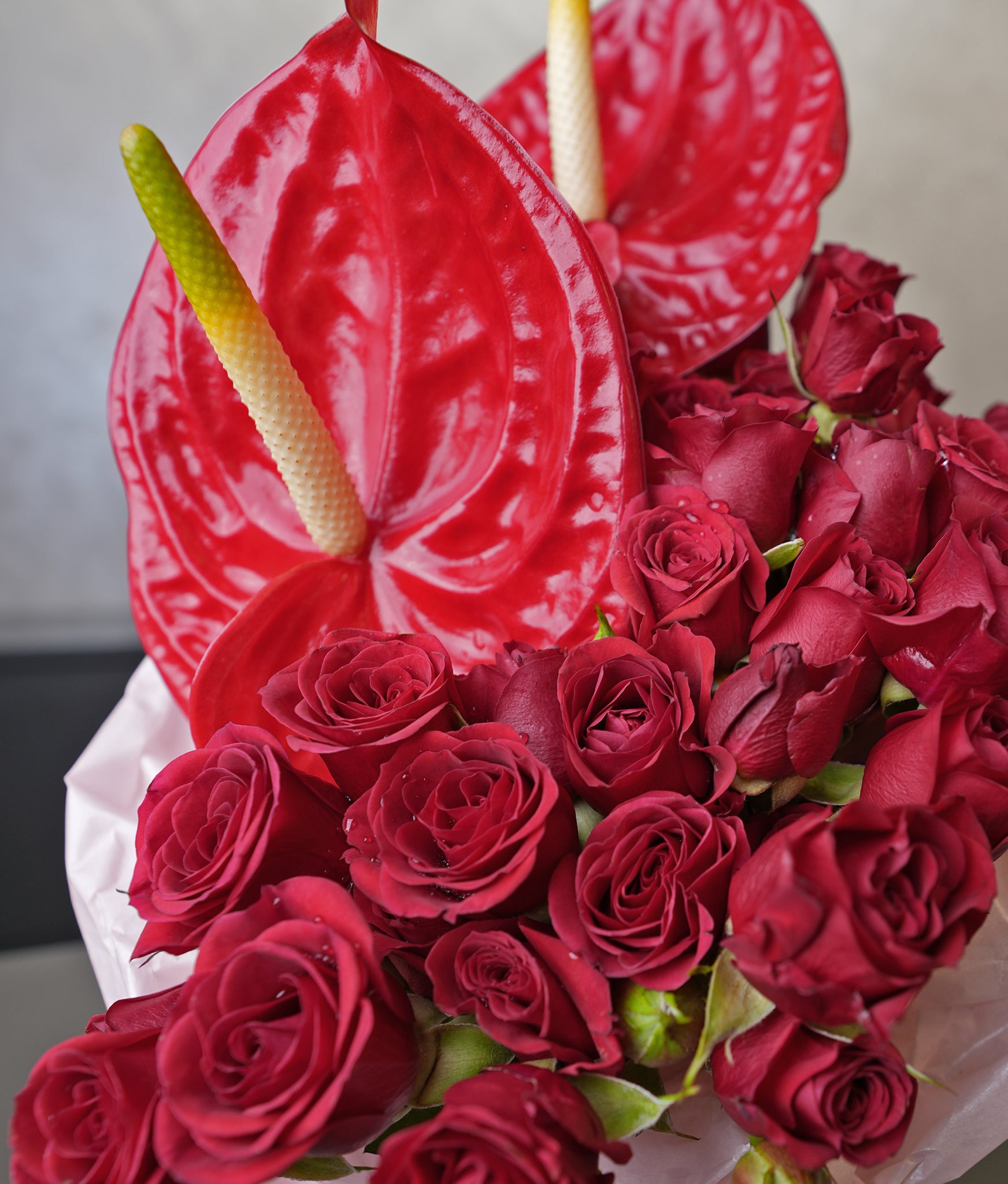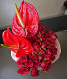 A bold expression of love, Flames of love features vibrant red anthuriums paired with lush red roses, symbolising passion, desire, and deep affection. The glossy anthuriums add a modern, sculptural touch, while classic roses bring timeless romance—together creating a statement of love that cannot be ignored.