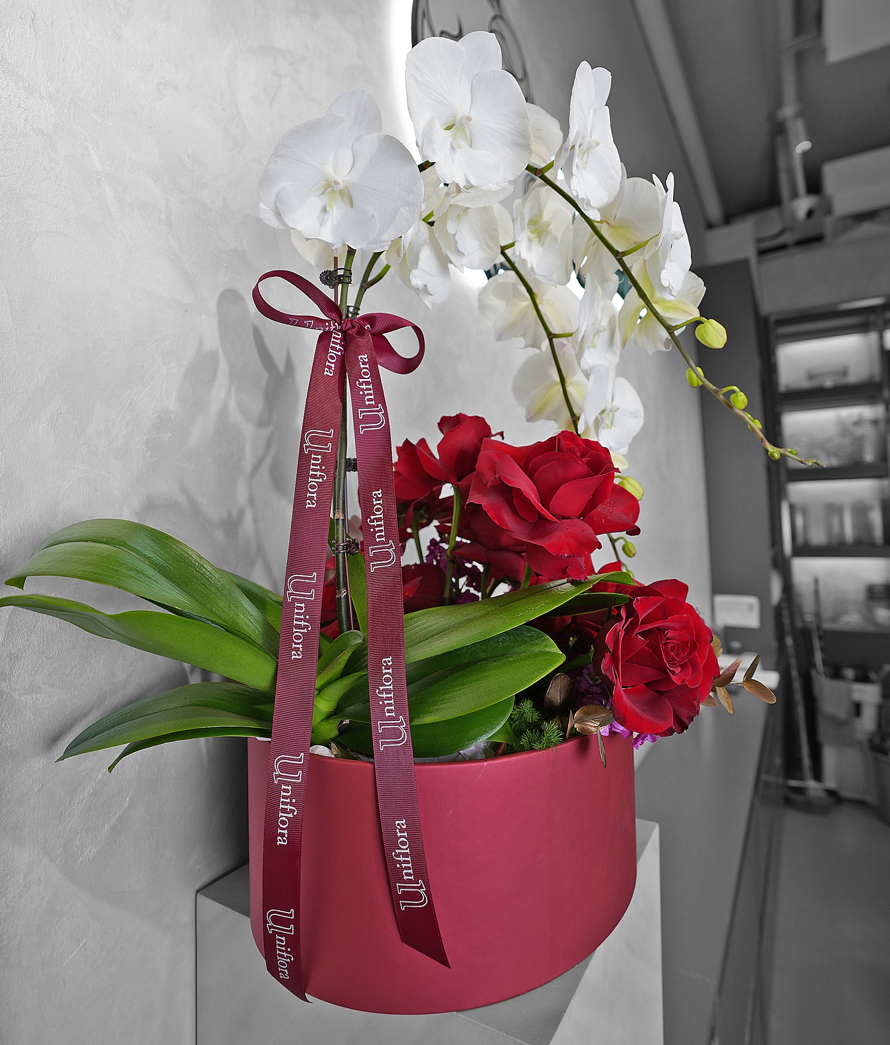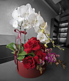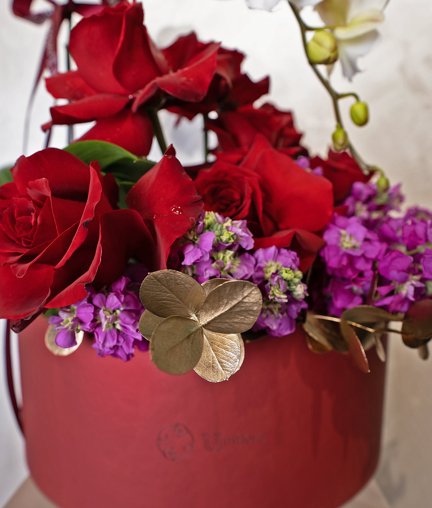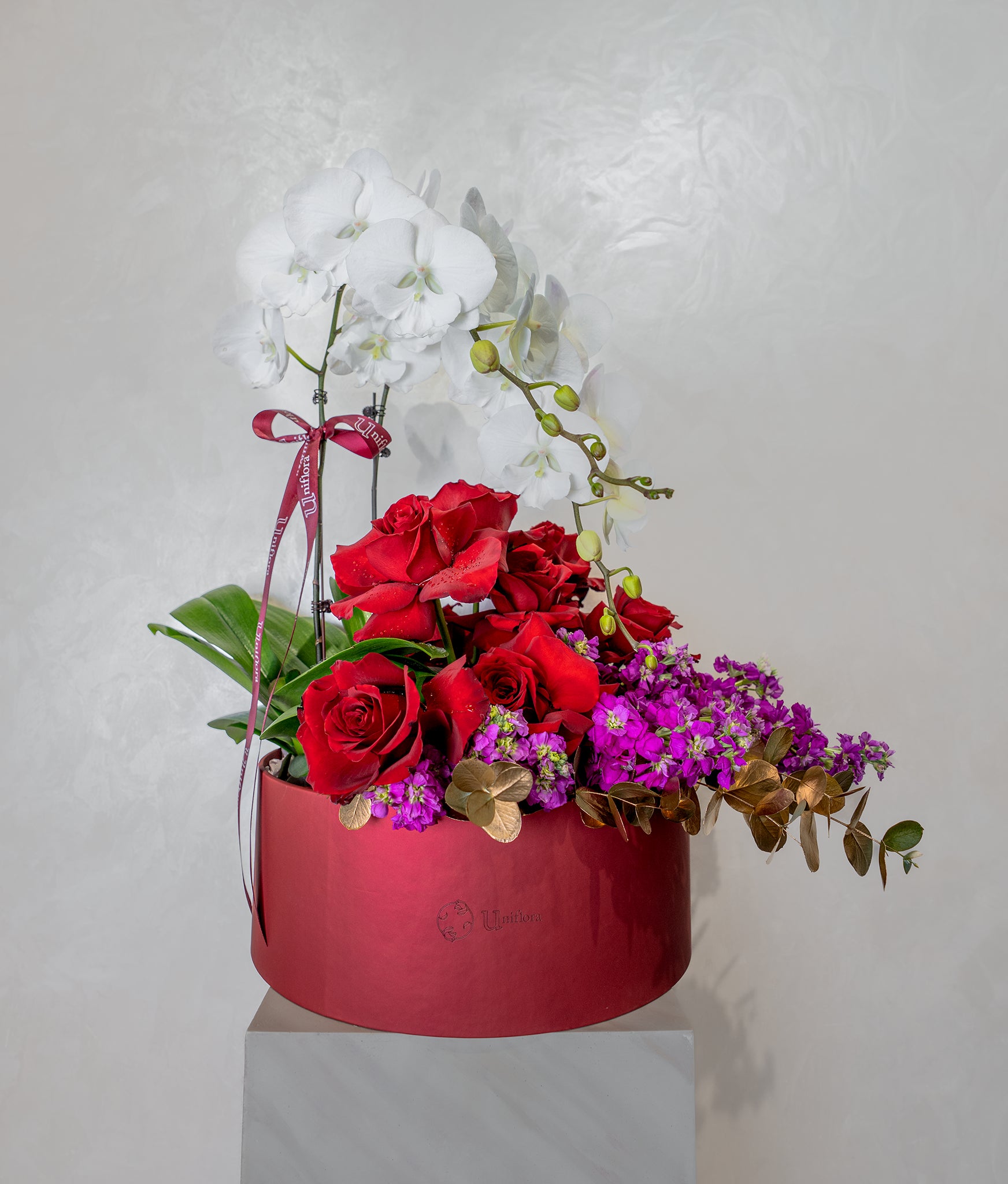 An exquisite composition of romance and refinement, Her Majesty features lush red roses, elegant orchids, and fragrant mathiolas, beautifully accented with gold-painted eucalyptus. Arranged in a red round box, this luxurious design blends classic passion with modern opulence.