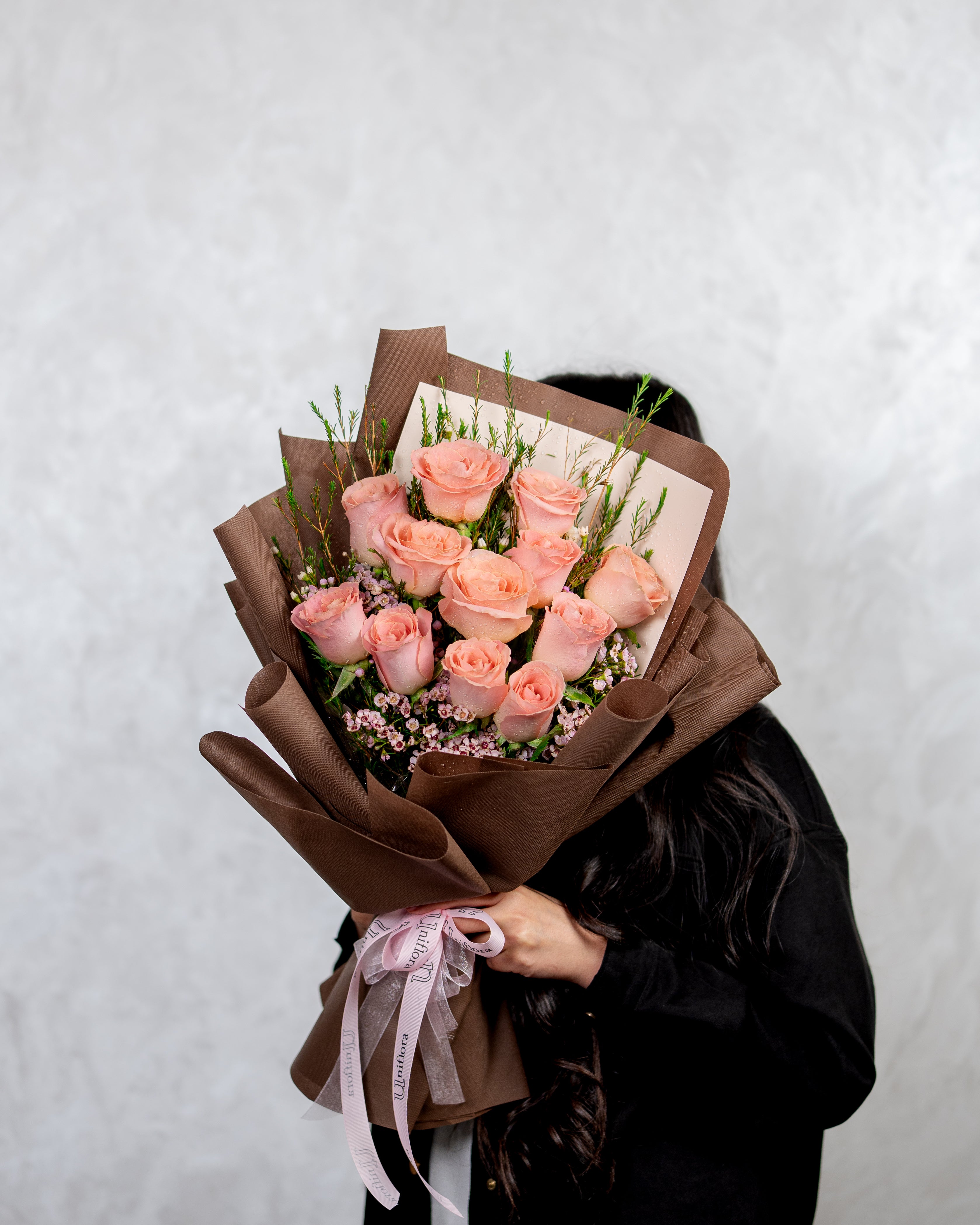 A soft and charming bouquet of 12 baby pink roses paired with delicate wax flowers, beautifully wrapped in earthy tones for a natural, elegant look. Symbolizing sweetness and affection, it’s perfect for thoughtful gifts and special moments.
