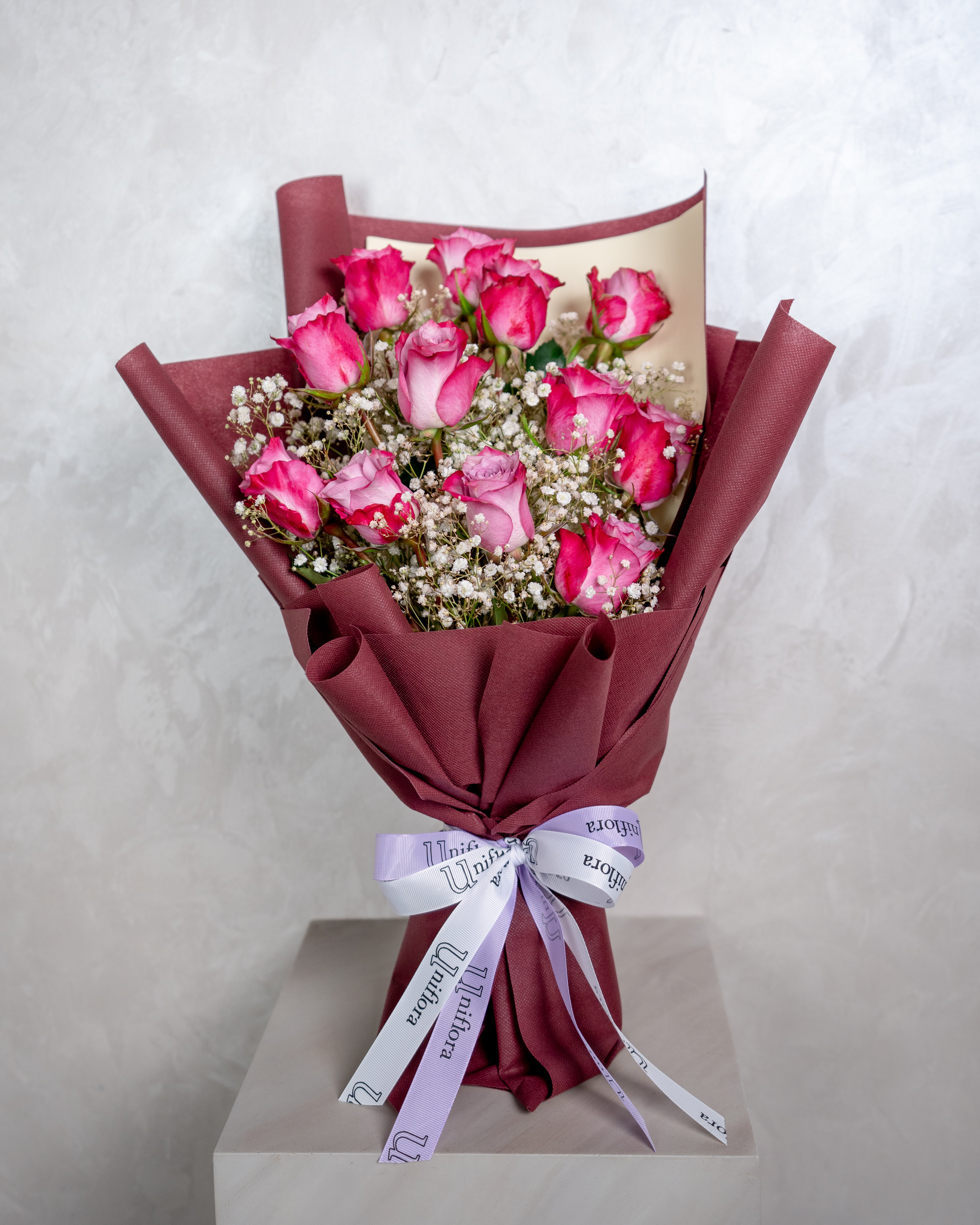 A stunning bouquet of 12 purple roses paired with delicate baby’s breath, beautifully wrapped for an elegant finish. Symbolizing admiration and charm, this bouquet is perfect for special occasions or simply to make someone feel truly appreciated.