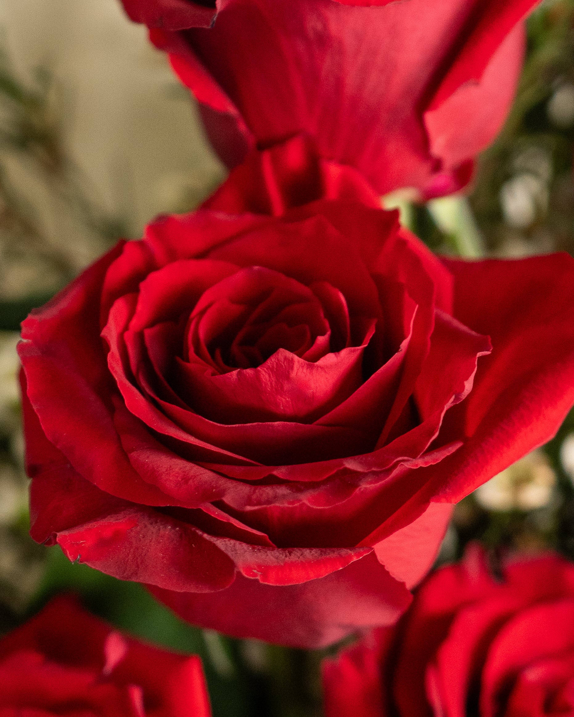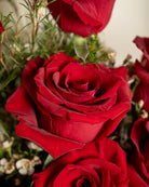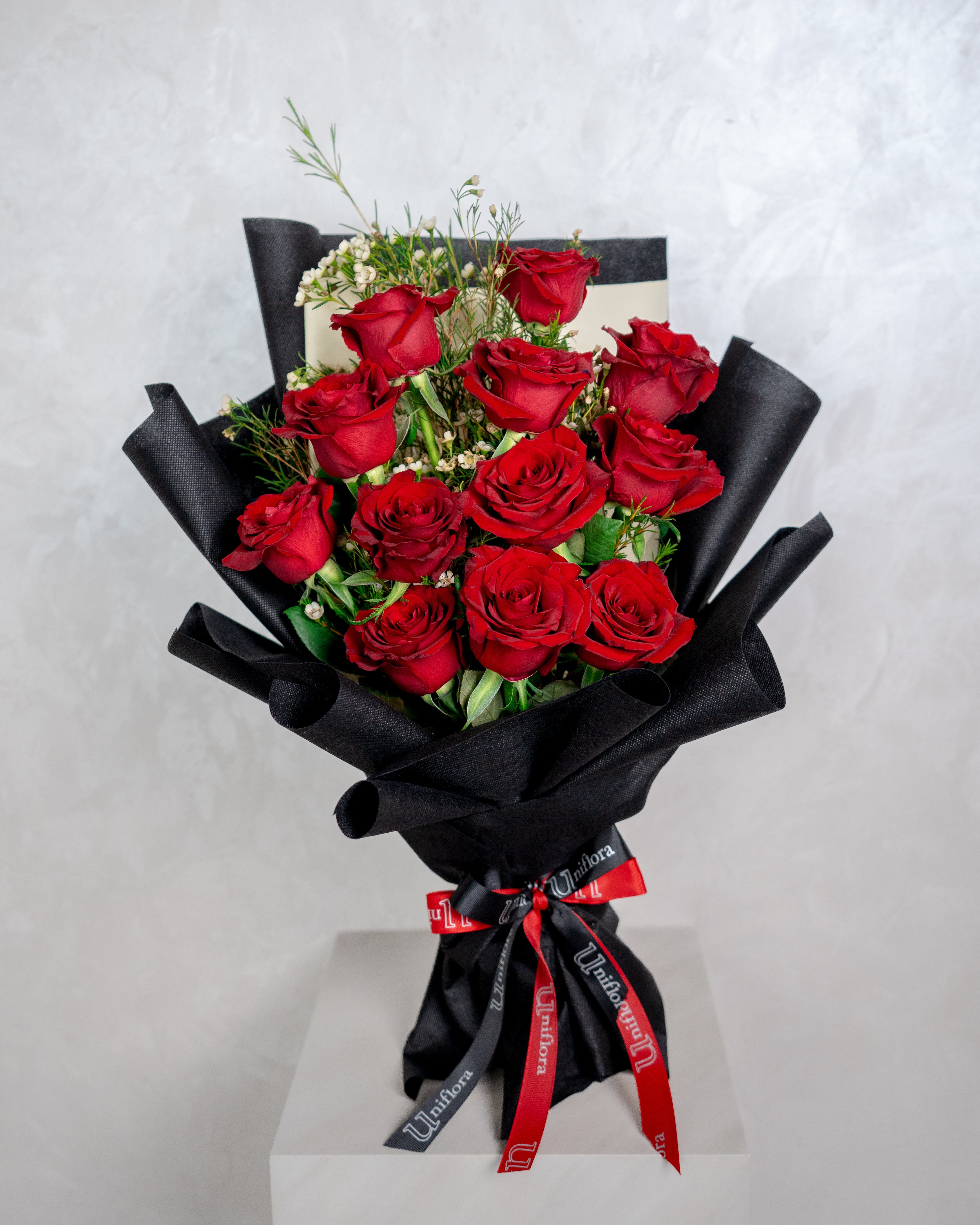 A striking bouquet of 12 red roses paired with delicate wax flowers, elegantly wrapped in black for a bold and luxurious finish. Symbolizing deep love and passion, this bouquet is perfect for romantic occasions or making a powerful statement.