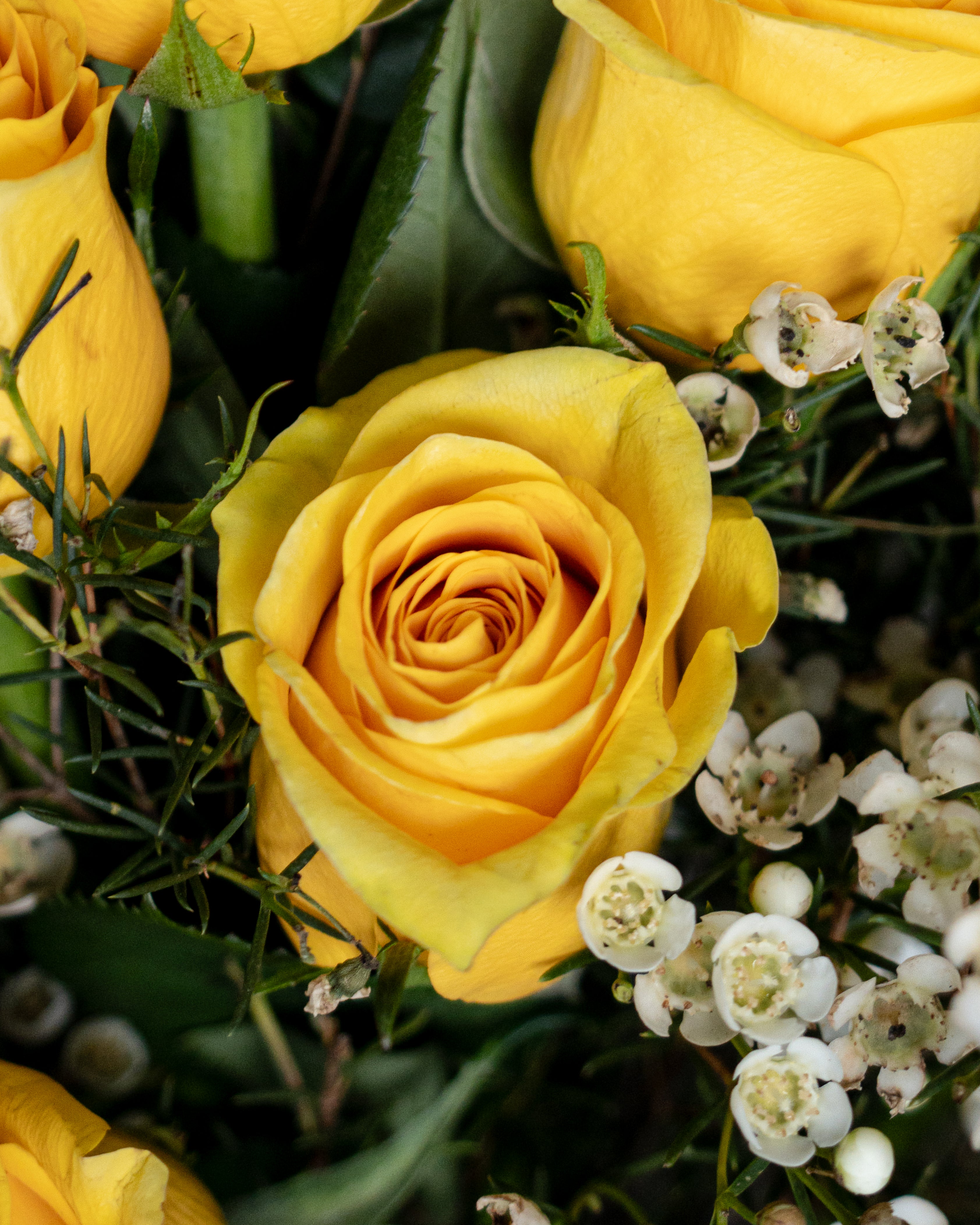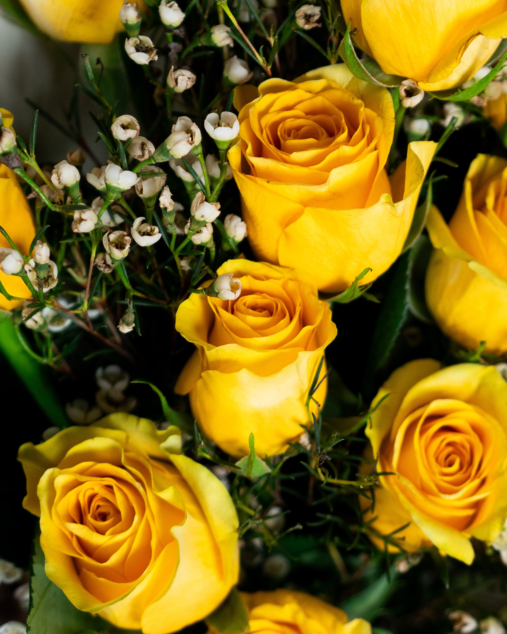 A cheerful and elegant bouquet featuring 12 fresh yellow roses paired with delicate pink wax flowers. Beautifully wrapped, it’s perfect for celebrating friendship, spreading joy, or brightening someone’s day.