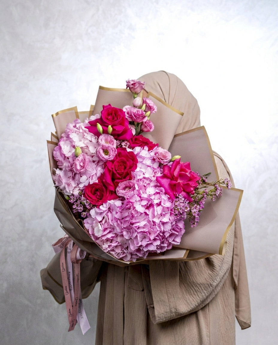 A soft and elegant bouquet featuring lush pink hydrangeas as the focal bloom, beautifully complemented by dark pink roses, delicate wax flowers, and graceful pink lisianthus. Designed in soothing shades of pink, this bouquet exudes charm and sophistication, making it a perfect choice for heartfelt gifting, celebrations, or adding a touch of floral elegance to any moment.