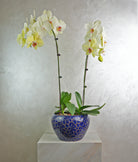 A stunning arrangement of two vibrant yellow orchid plants elegantly placed in a deep blue ceramic pot, with its smooth, polished finish, provides a striking and elegant base, enhancing the orchids' beauty while complementing any interior space.