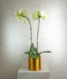 Brighten any space with this charming mini double-stem yellow orchid arrangement, elegantly presented in a sleek gold metal pot. Its vibrant blooms bring a touch of cheer and sophistication, making it a perfect gift or a stunning accent for your home or office.