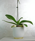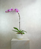 A graceful statement piece, this single lavender medium size orchid stands tall in a sleek white ceramic pot, adorned with gold mirror accents for a touch of festive charm. Perfect for gifting or adding elegance to any space, it blends sophistication with a celebratory sparkle.