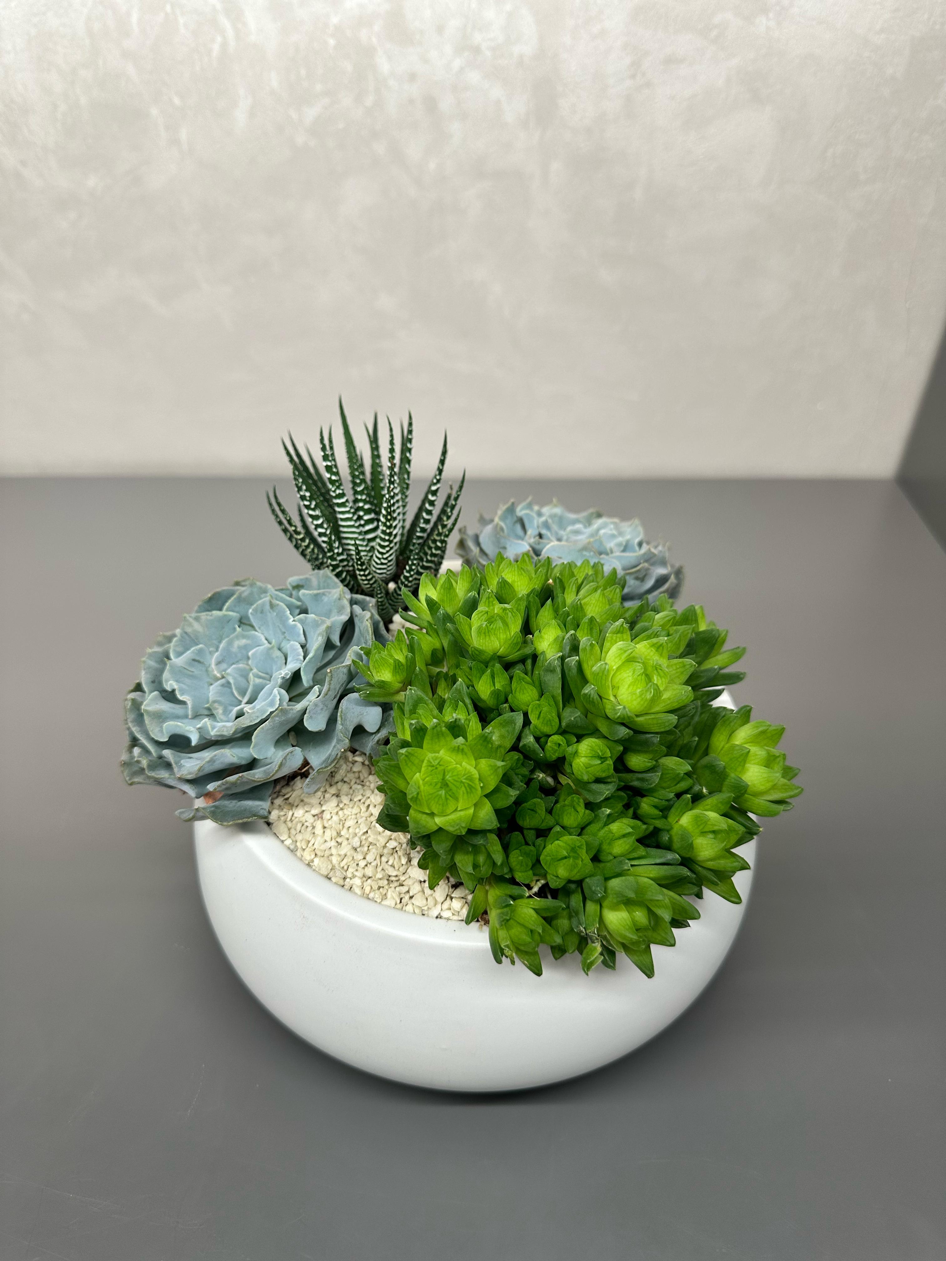 Zamardi—a stunning succulent arrangement that brings the beauty of the desert indoors. This thoughtfully curated piece features vibrant emerald-green Haworthia and Echeveria, known for their sculptural forms and low-maintenance charm. Each succulent is nestled in a sleek ceramic pot, creating a modern, earthy aesthetic that suits any interior.