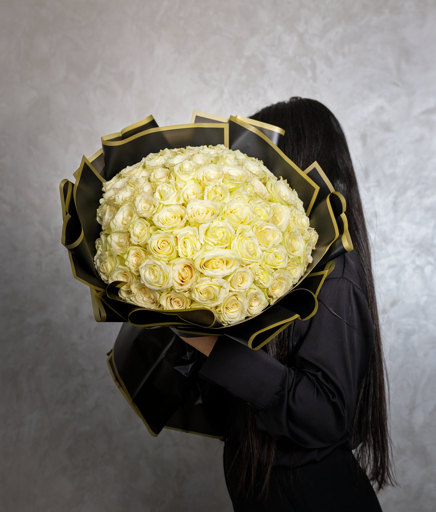 White Charm is a striking bouquet of 50 pristine white roses, carefully arranged in a black wrapper with elegant gold borders.