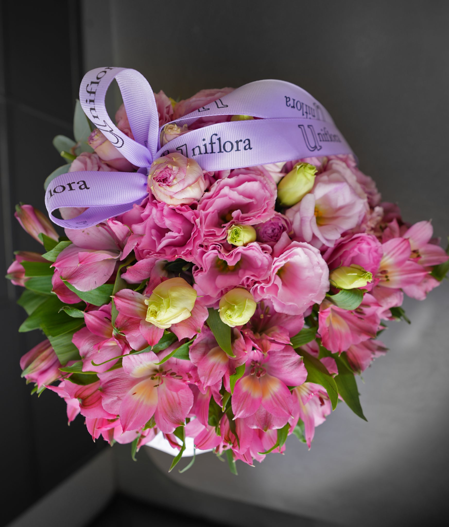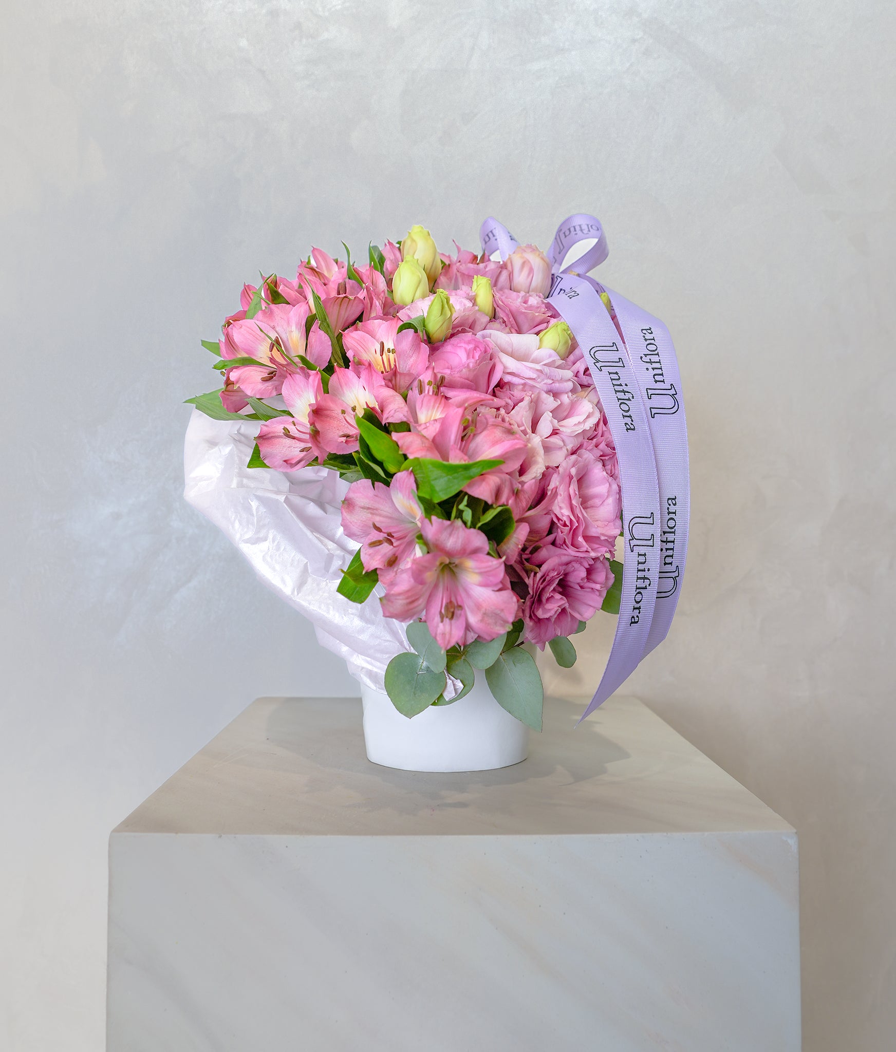 Soft, feminine, and full of charm,Pink Poetry features a delicate mix of pink alstroemerias and lisianthus, arranged in a heart-shaped design and wrapped in elegant paper art. Housed in a sleek white box, this arrangement embodies gentle affection, sweet romance, and thoughtful elegance.