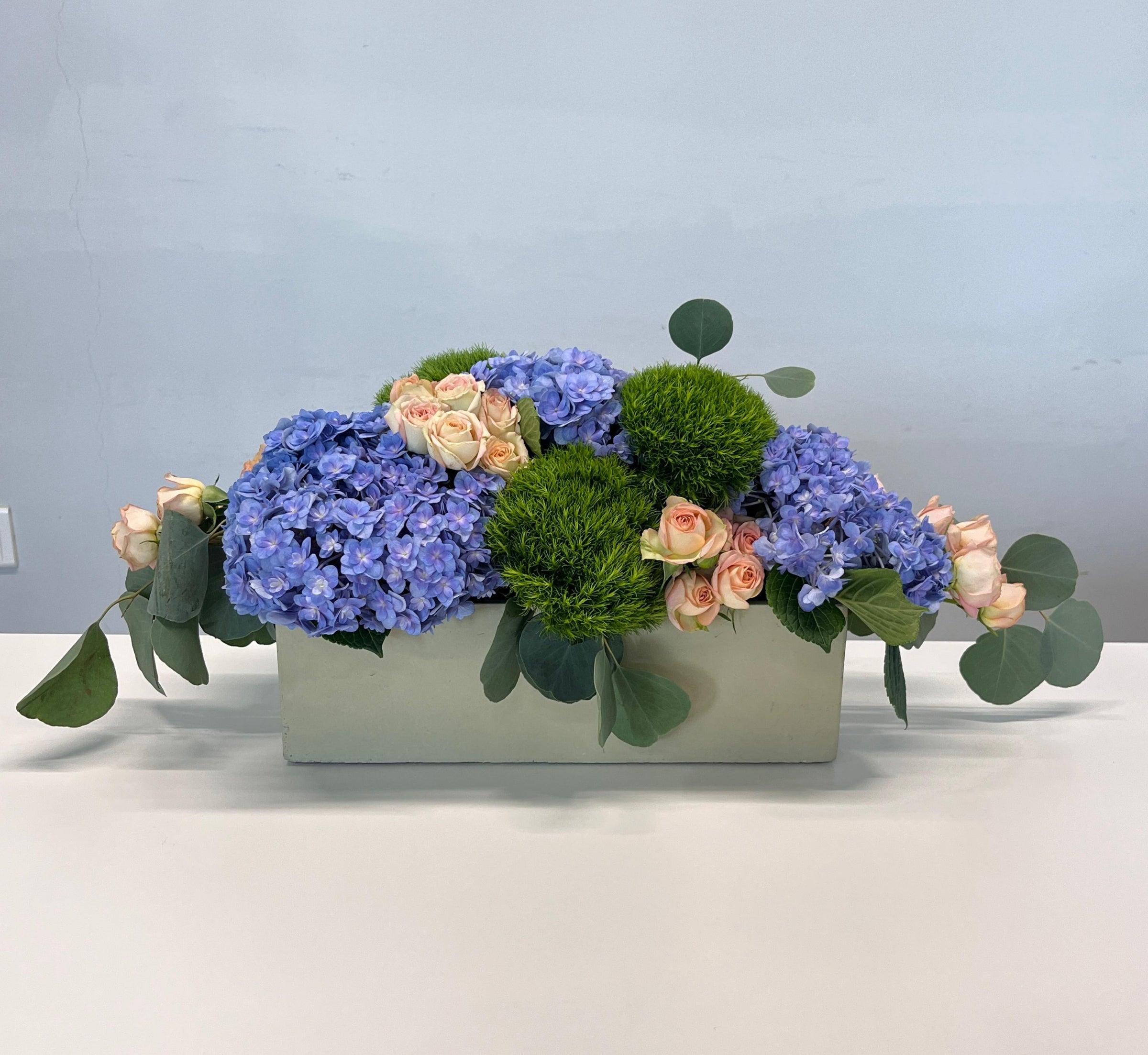Inspired by serene coastal mornings, this Blue mirage blends the calming beauty of blue hydrangeas with soft peach blooms and fresh greenery, creating a refined harmony of color and form. Set in a sleek long rectangular vase, this arrangement brings a modern touch to classic elegance. It's perfect for dining tables, reception counters, or heartfelt gifting.