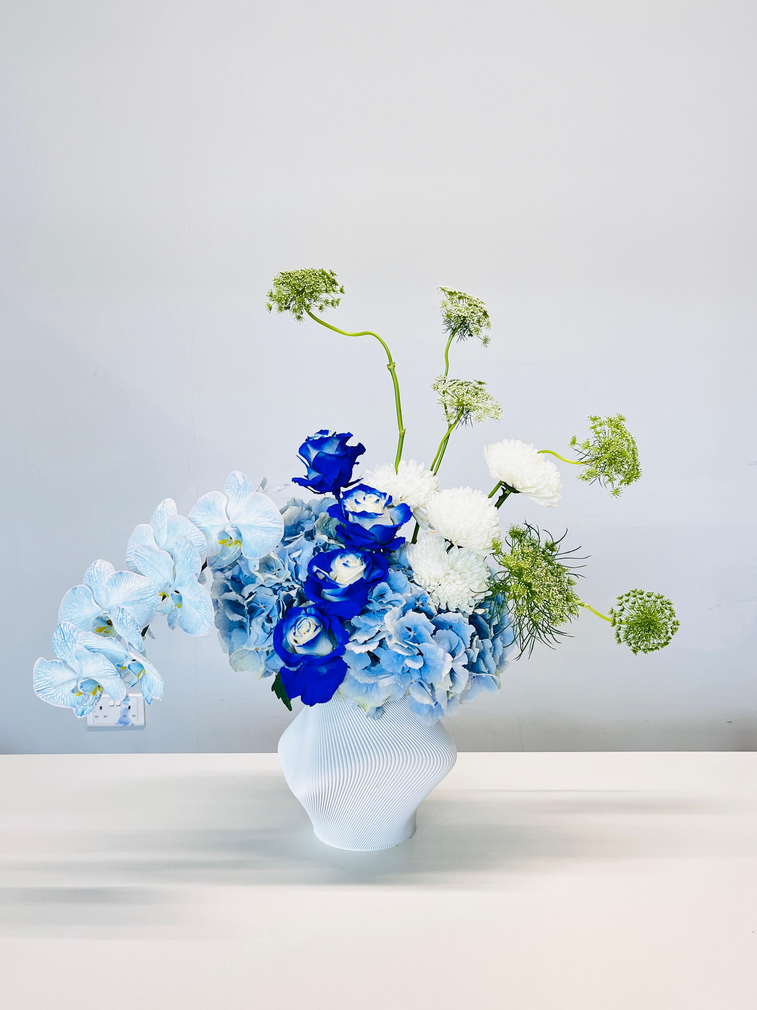 Featuring cloud-like blue hydrangeas, ethereal light blue dyed orchids, blue-tinted roses, delicate sprigs of ammi majus, and textured pops of green trick, this piece brings a sense of cool serenity and contemporary luxury to any space.