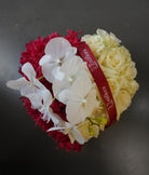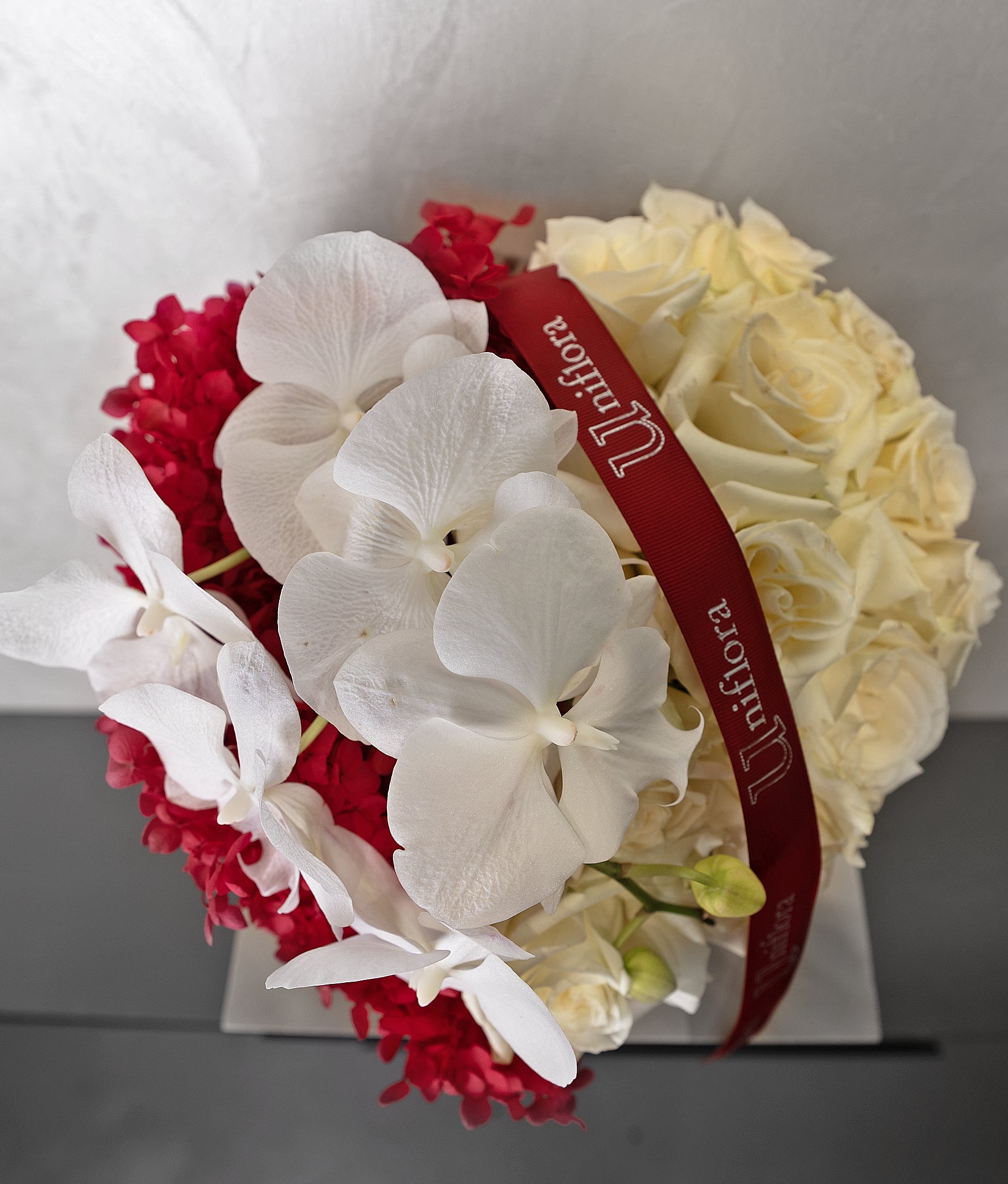 Chic and gracefully composed, Classic Grace brings together pristine white roses, bold red preserved hydrangea, and elegant orchid blooms in a premium leather-finish box. The harmonious blend of textures and colors delivers a look that is both powerful and refined.