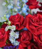 Blueberry is a captivating vase arrangement that beautifully blends the charm of deep red roses with the cool elegance of blue delphiniums. The vivid contrast of colors creates a fresh, modern, and luxurious look — a perfect balance of passion and calm. Designed to stand out, this arrangement brings a touch of sophistication and artistic flair to any space.