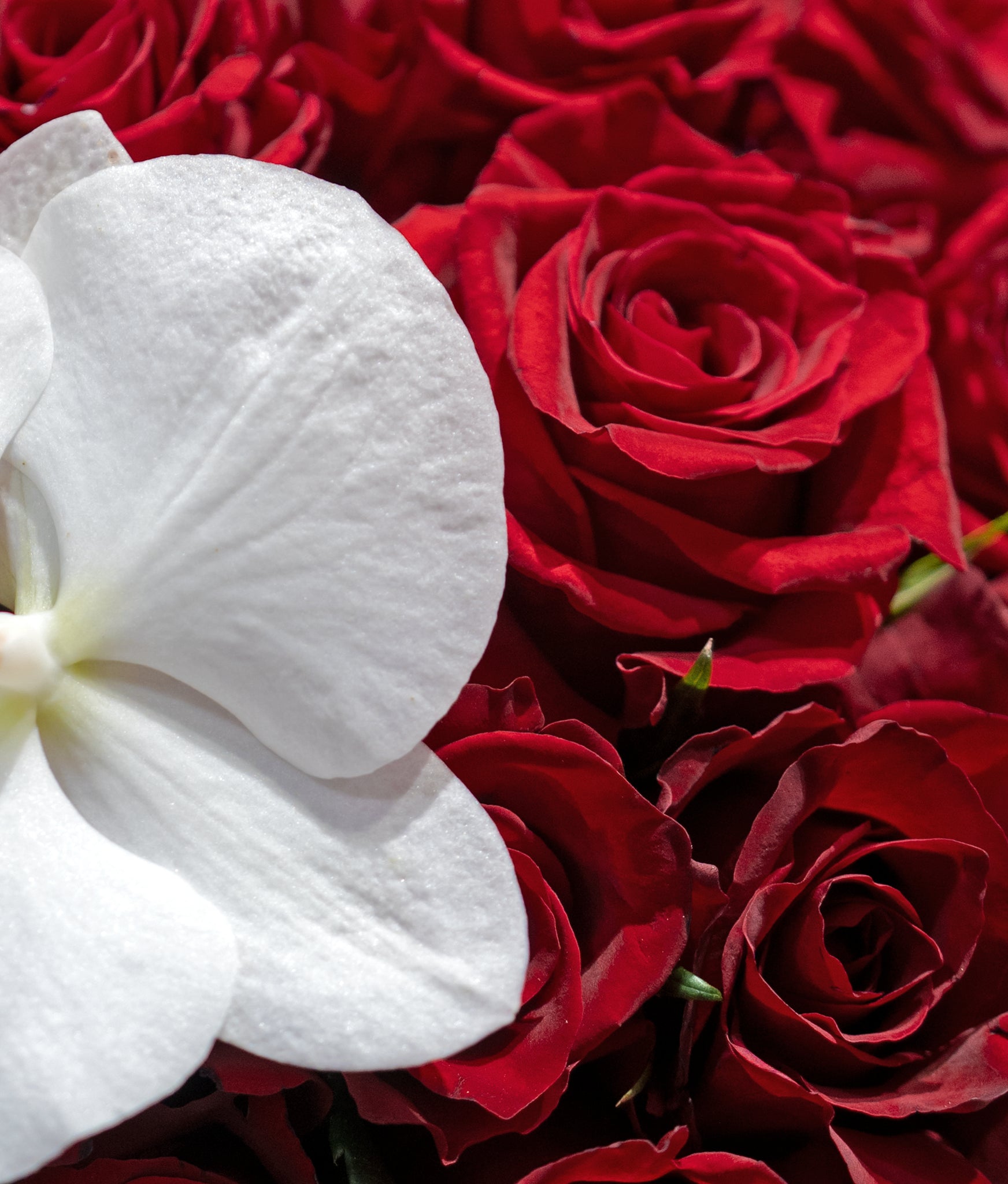 Includes: 50 red roses, 1 orchid stem, red and white wrapping paper